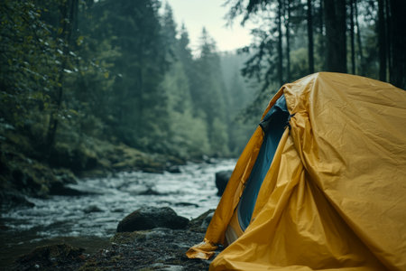 A solitary yellow tent set against a misty forest backdrop. The tent is positioned on a rocky path, surrounded by dense foliage.