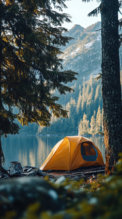 A cozy camping experience unfolds with a stunning sunrise illuminating the lake view from within a tent. The tranquility of nature sets the perfect backdrop for outdoor adventure.