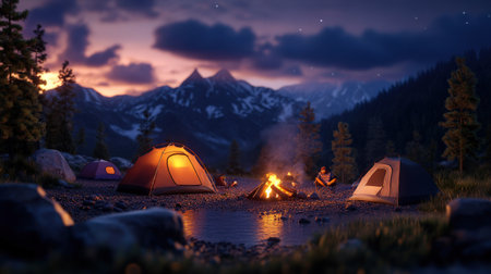 A solitary, warmly lit tent glows against the deep twilight sky, nestled in a serene mountain valley. Stars begin to emerge above the silhouetted peaks, evoking peace, adventure, and the quiet beauty of nature.