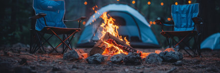 Bonfire in a forest setting, with camping gear around and a tent in the background. AI generative