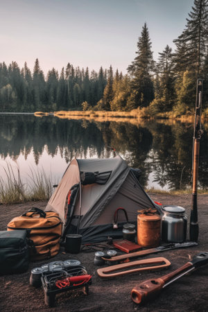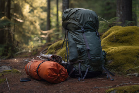 Adventure awaits with camping gear ready for exploration in a serene forest setting