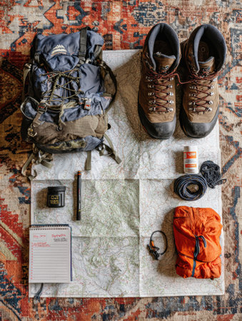 Outdoor adventure essentials spread out on a map with sturdy boots, a backpack, and a safety checklist prepared for a journey in nature.