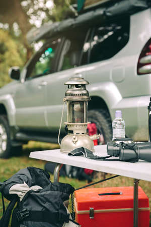 Oil lamp and binoculars over camping table in the forest with offroad vehicle in the background