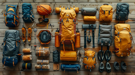 A variety of items laid out on a table. Generative AI. Outdoor and adventure clothing brand, various items, knolling, top view, flat lay overhead.