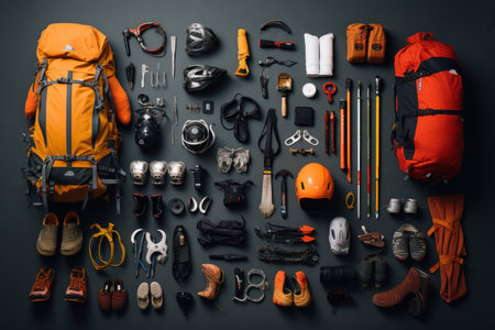 top view of a neatly arranged set of mountain climbing equipment, created with generative ai