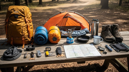 A close-up of camping essentials laid out on a picnic table, including a map, cooking gear, and food supplies, ready for a camping adventure.