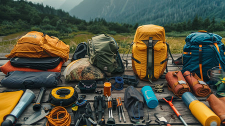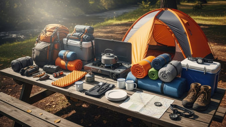 An assortment of camping equipment is arranged on a wooden picnic table, showcasing gear for outdoor adventures. Various backpacks, sleeping bags, and a tent are prominent. The composition features vibrant colors, contrasting light, and an inviting atmosphere, suitable for illustrating outdoor recreation themes. The image is suitable for promotional materials or editorial content.