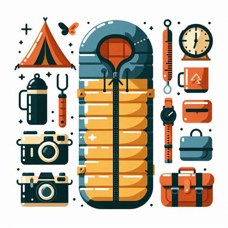 Camping equipment set. Vector illustration in flat style. Tent, backpack, camera, binoculars, compass, flask, compass.