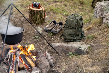 Hiking and camping equipment in forest. Backpack, water bottle and leather ankle boots. Panoramic view with copy space.