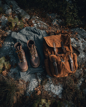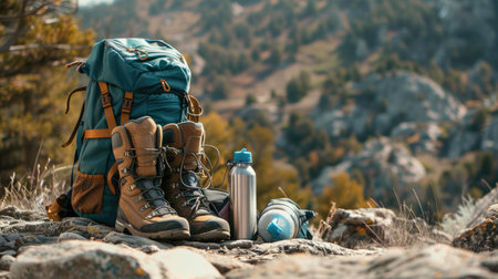 Hiking boots and gear ready for an outdoor adventure, set against a rocky terrain. AIG50
