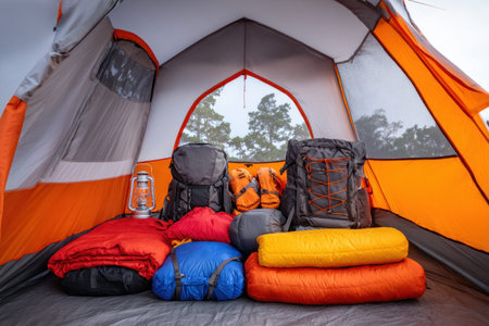 Camping equipment neatly arranged inside a tent, including backpacks, sleeping bags, and a lantern, evokes a sense of preparedness for outdoor adventures