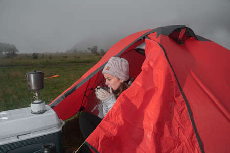 Beautiful Latin woman sitting alone outside her red tent in the middle of a green field drinking tea from her cup next to a cooler on a cloudy sunrise