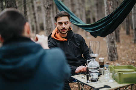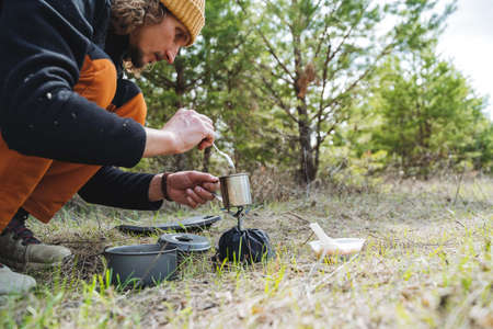 Man brewing coffee outdoors using portable gas stove during camping trip in forest