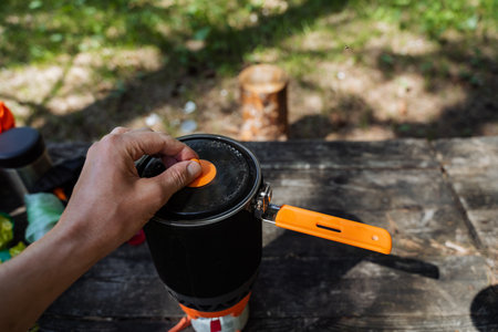 person cooking in nature camping outdoor, cooker prepare breakfast picnic on metal gas stove, hot tea outside; campsite lifestyle