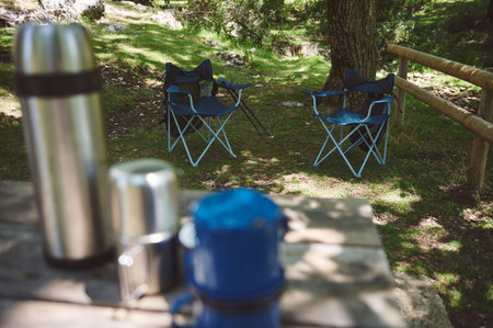Bright outdoor setting with two camping chairs, thermos, and blue coffee pot on a picnic table under trees, encapsulating leisure and nature's tranquility.