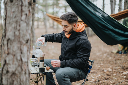 Man Enjoying an Outdoor Picnic Setup in a Forested Area During Leisure Camp Time
