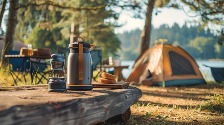 A camping scene features a table with coffee equipment and a lantern, set against a backdrop of rolling hills. The image displays natural colors, with a composition that emphasizes the environment. This setting suggests outdoor adventure, suitable for various editorial and promotional applications.