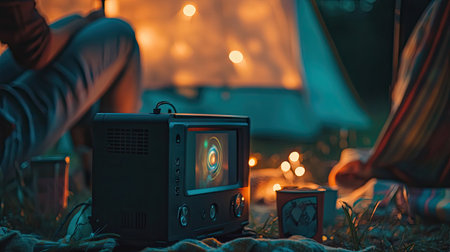 Enjoy a cozy camping scene featuring a vintage television illuminated by fairy lights, creating a nostalgic atmosphere perfect for outdoor adventures and relaxation.