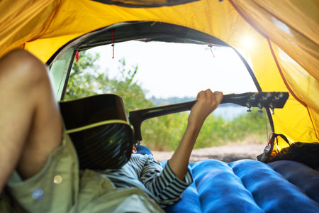 Teenage boy lying in tent playing guitar. Young man enjoying outdoor recreation near river. Camping. Summer vacation. Local tourism concept. View from the inside of tent
