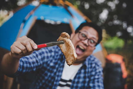 Asian man travel relax camping in the holiday. camping on the Mountain. sit relax read a book In the chair. Thailand