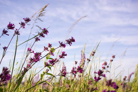 Beautiful purple wild flowers meadow in warm sunset evening light. Nature background.
