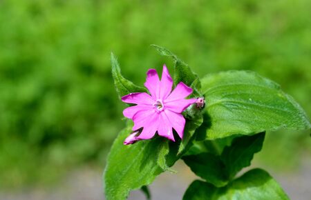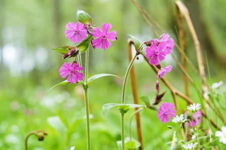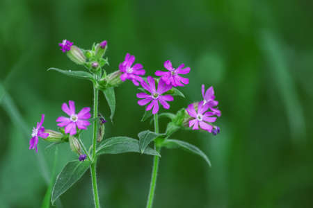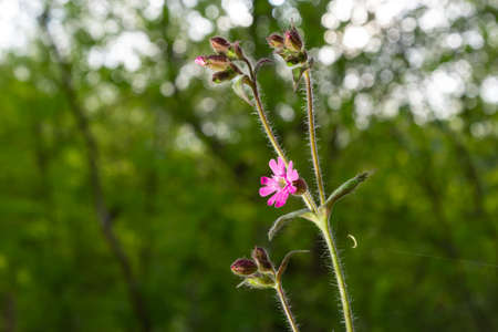 Flowers of a perennial plant Silene dioica known as Red campion or Red catchfly on a forest edge in the summer sunset, close-up