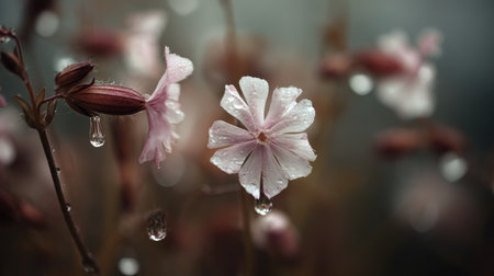 Soft rain falling gently on Silene, with water droplets forming and slowly dripping. The background is softly blurred with a natural, moody atmosphere.