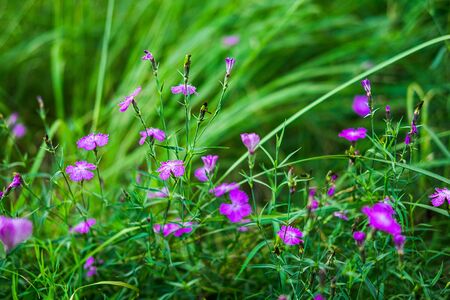 Lilac wildflowers on a background of bright green grass. Natural background. Soft focus.