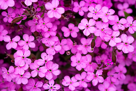 Small pink purple flowers on green natural background. Blooming flora in spring garden. Wildflowers blossoming in summer meadow. Floral postcard.