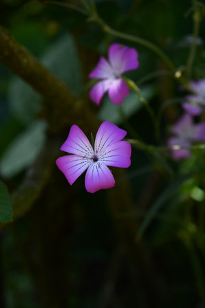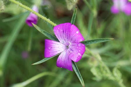 Corn cockle (Agrostemma githago) flowers. Caryophyllaceae annual plants. Five-petal pink flowers bloom in early summer.