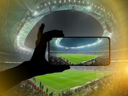 Fan hand with mobile phone photographing football game. Using a smartphone at a soccer stadium.