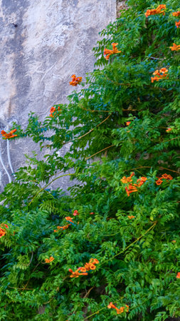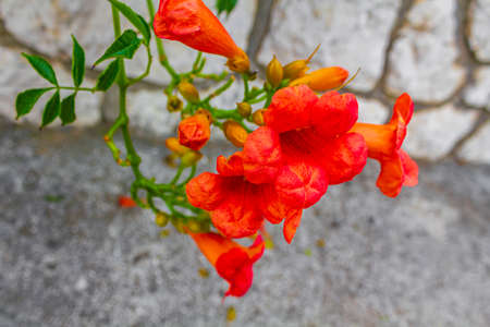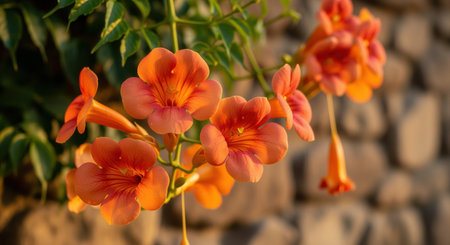 Vibrant orange trumpet flowers blooming on a lush green vine, showcasing intricate petals and stamens. blurred stone wall provides a natural backdrop.