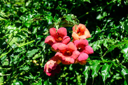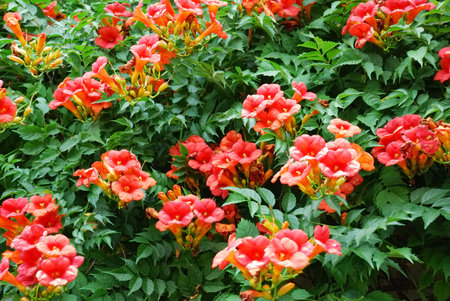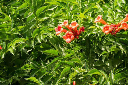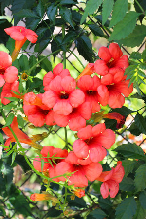 Many vivid orange red flowers and green leaves of Campsis radicans plant, commonly known as the trumpet vine or creeper, cow itch or hummingbird vine, in a garden in a sunny summer day