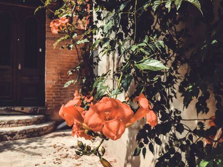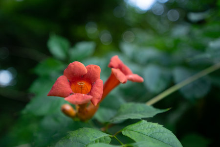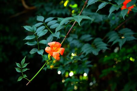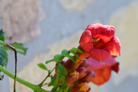 Red-orange Campsis flower. Curly garden flower. Selective soft focus