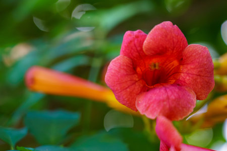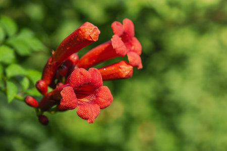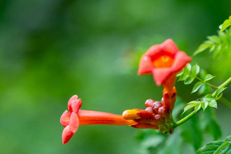 Red blossom of trumpet vine, trumpet creeper or campsis radicans on a sunny summer day on the blurred green nature background