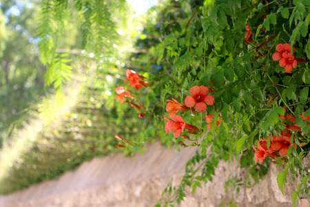 Campsis Flamenco bright orange flowers winding over the fence in greenery.
