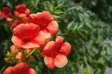 Beautiful red flowers of the trumpet vine or trumpet creeper (Campsis radicans). Branch of trumpet vine with many red flowers. ampsis Flamenco bright orange flowers winding over the fence in greenery