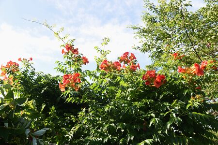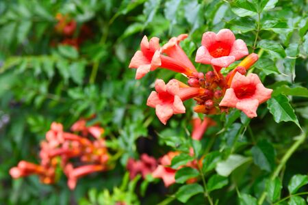 Trumpet vine flowers. Bignomiaceae deciduous vine. The flowering season is from July to August. It grows vines on trees and walls and blooms large orange and red flowers.