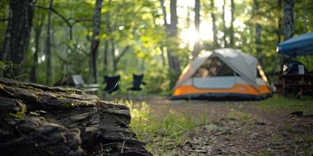 illustration of camping tents and camp furniture set up in a forest with blue sky with Generative AI