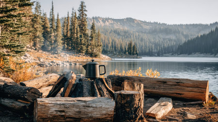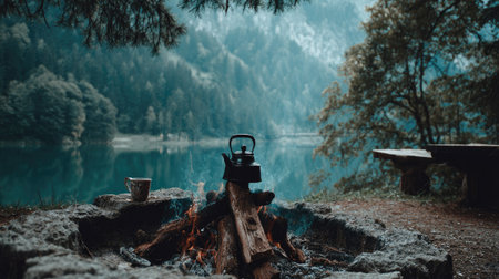 Camping on the shore of a mountain lake with a kettle and a cup of hot tea.