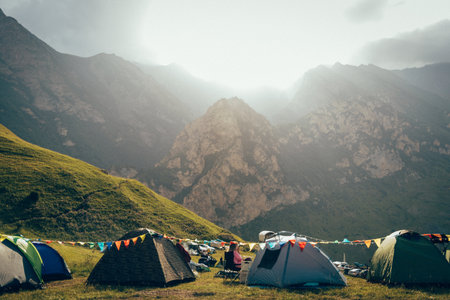 Camping in the mountains with colorful flags and tents