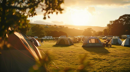 A hazy sunset over a green meadow dotted with tents and campers highlighting a peaceful and idyllic spot for a tranquil summer escape away from the hustle and bustle of city life.