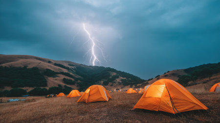 A breathtaking view of orange tents illuminated by warm light under a dramatic stormy sky, complete with striking lightning over rolling hills.