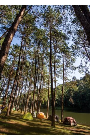 Tent that tourists opened at the pine trees. Near the reservoir in the national park of Thailand.
