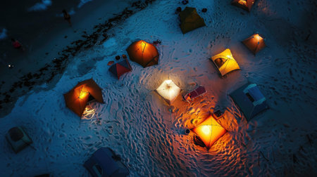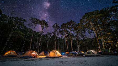 Cozy illuminated tents glow under a starry night sky, promising adventure and escape in nature's embrace