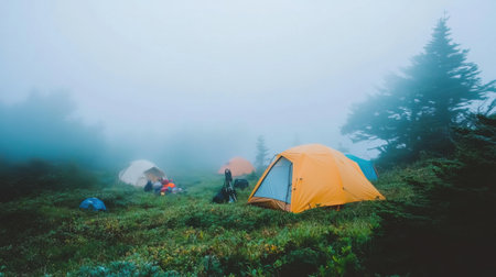 A serene camping scene shrouded in mist showcases colorful tents nestled in a lush landscape. Perfect for adventure and outdoor enthusiasts seeking tranquility.
