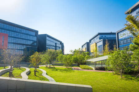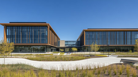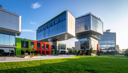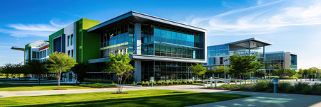 A stunning view of a modern office building complex featuring sleek architecture, expansive glass facades, and complementary landscaping under a vibrant blue sky.