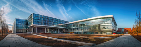 Business complex showcases glass and steel design. It stands under an open pastel sky, emphasizing the minimalist architecture and structure.