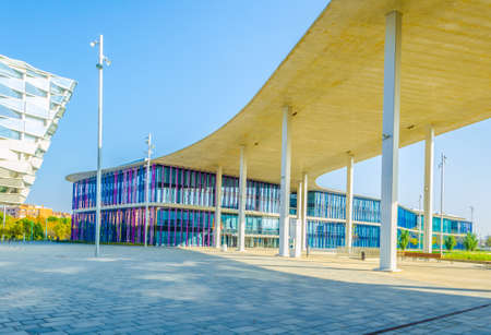 Milan, Italy - April 25, 2022: street view of sunset in Milan architecture with a brand new golden office building in Romolo area. No people are visible.