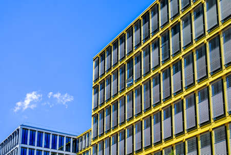 Modern building facade in business district against the blue clear sky. Architecture and construction concept